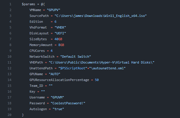 Bước 6, chỉnh sửa file C:/HyperV/Easy-GPU-PV/CopyFilesToVM.ps1, chỉ cần sửa một vài thông tin nằm trong phần $params